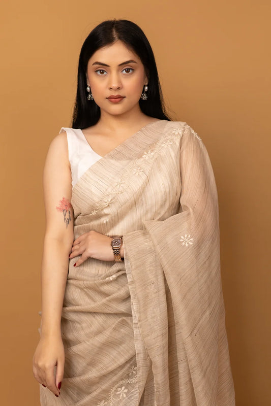 Beige Handcrafted Cotton Saree with Subtle Floral Embroidery