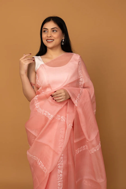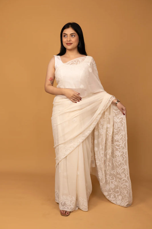 Handcrafted Cream Chikankari Saree with Floral Embroidery & Sheer Elegance