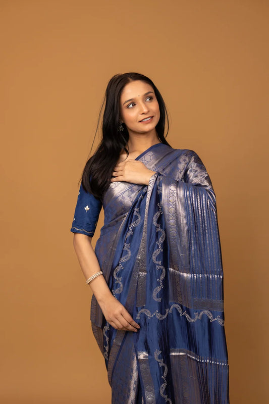 Handwoven Navy Blue Silk Saree with Silver Zari Weaving & Designer Border