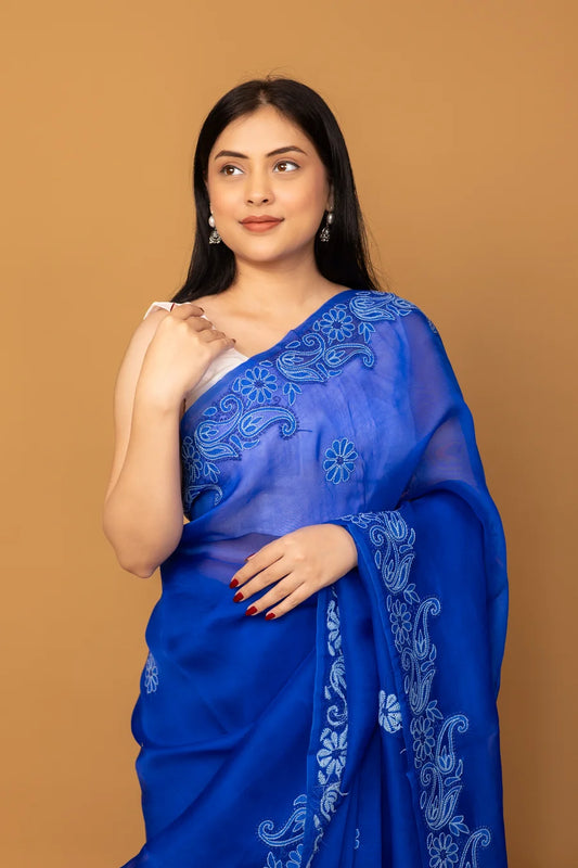 Royal Blue Cotton Saree with Intricate Paisley & Floral Embroidery