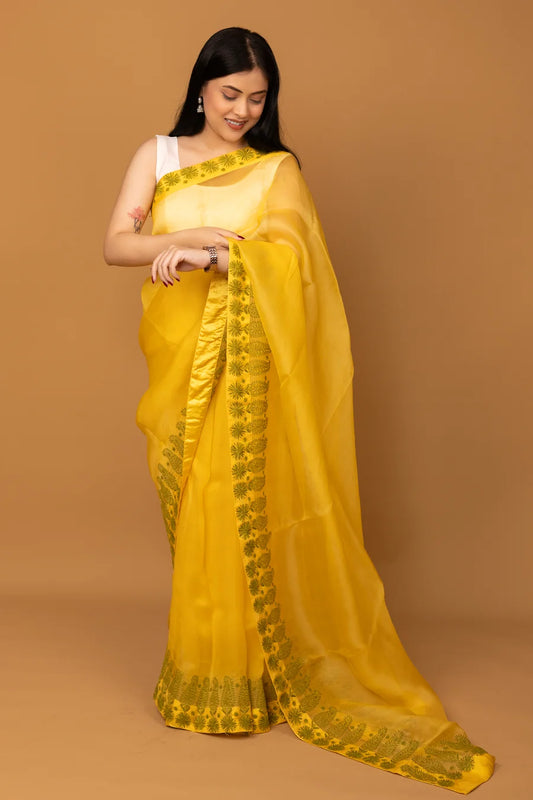 Bright Yellow Cotton Saree with Traditional Floral Border Design