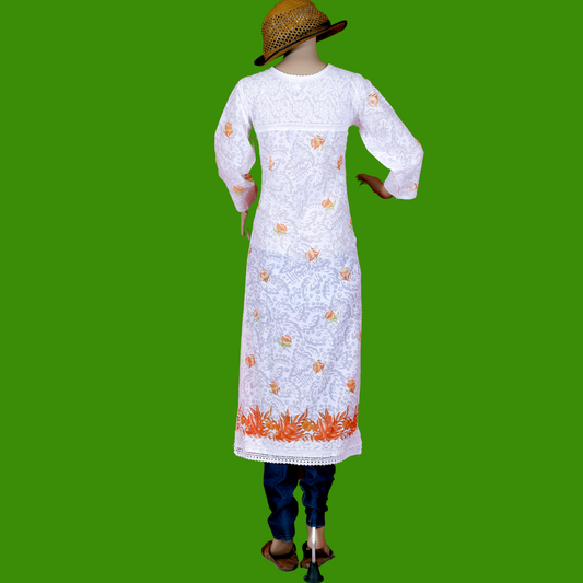 Cotton Embossed Chikankari Kurta with Orange print (White)