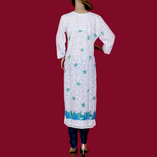 Cotton Embossed Chikankari Kurta with Blue print (White)