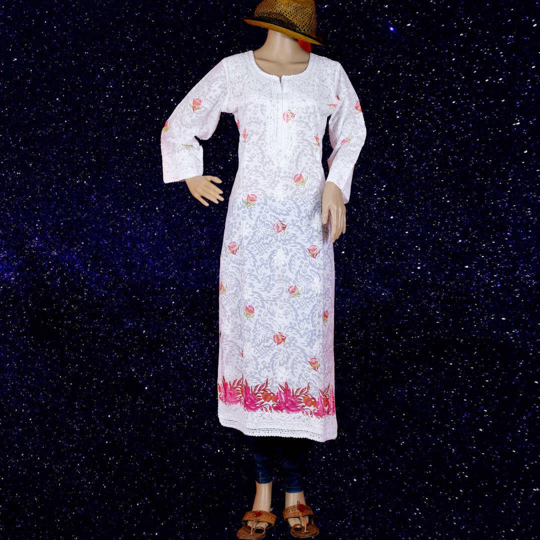 Cotton Embossed Chikankari Kurta with Pink print (White)
