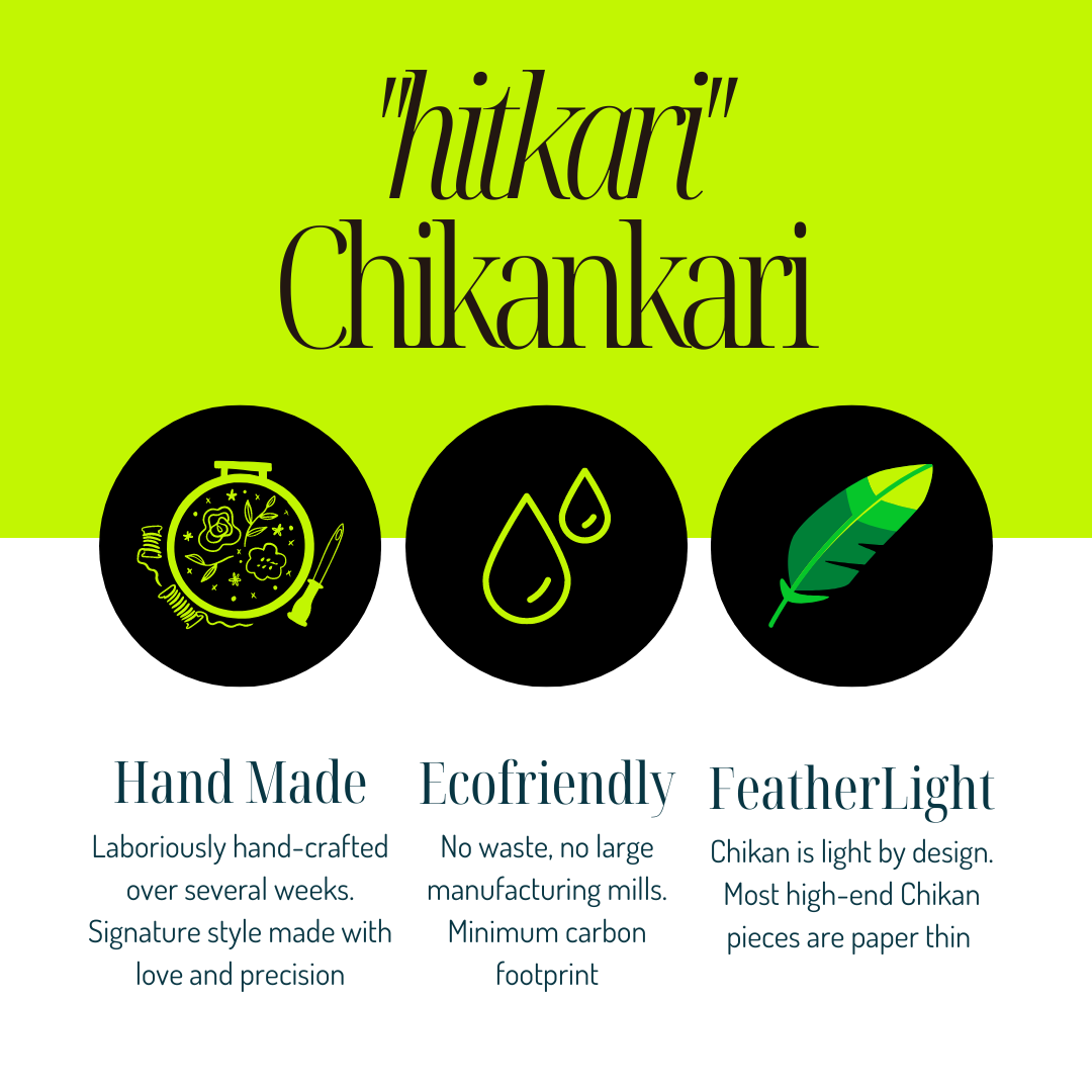 Chikankari work is labour of love Handcrafted by artisan who have honed their skill over decades. Each piece is unique and a signature of your thoughfulness.