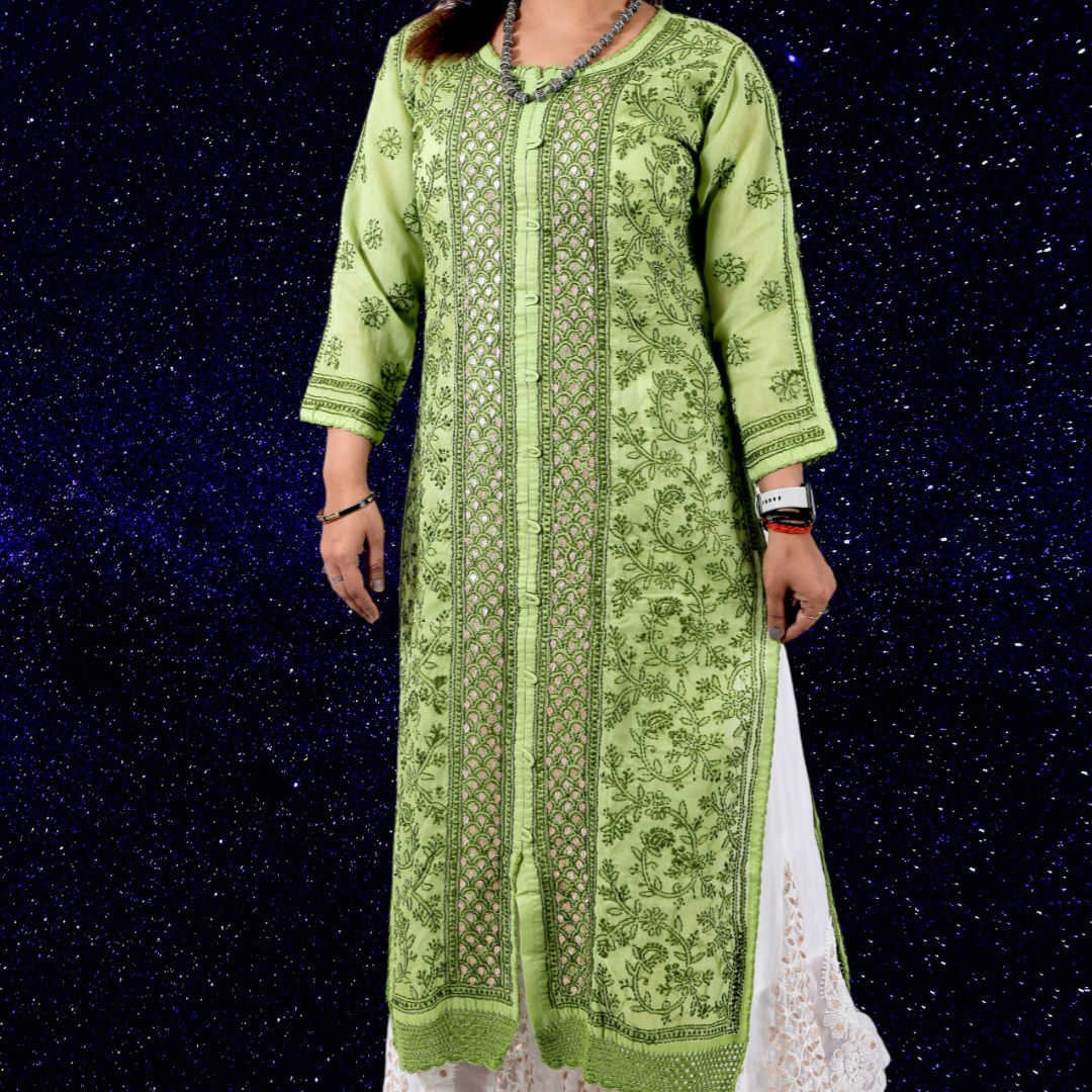 Be happy, positive and nothing but magical this festive season with this gorgeous Green Cotton Voile Kurta with beautiful floral motifs accentuated with intricate detailing of Chikankari embroidery with bakhia, phanda and murri work done in green thread . GotaPatti work in the front of the kurta and a beautiful crochet on the neckline and on the panel of the kurta enhances its look. The back of the kurta and sleeves have beautiful bootis. Team it up with your denims for your college or office look. You can also make it look dressy by pairing it with Palazzo or cotton pants to give it a splash of ethnicity.