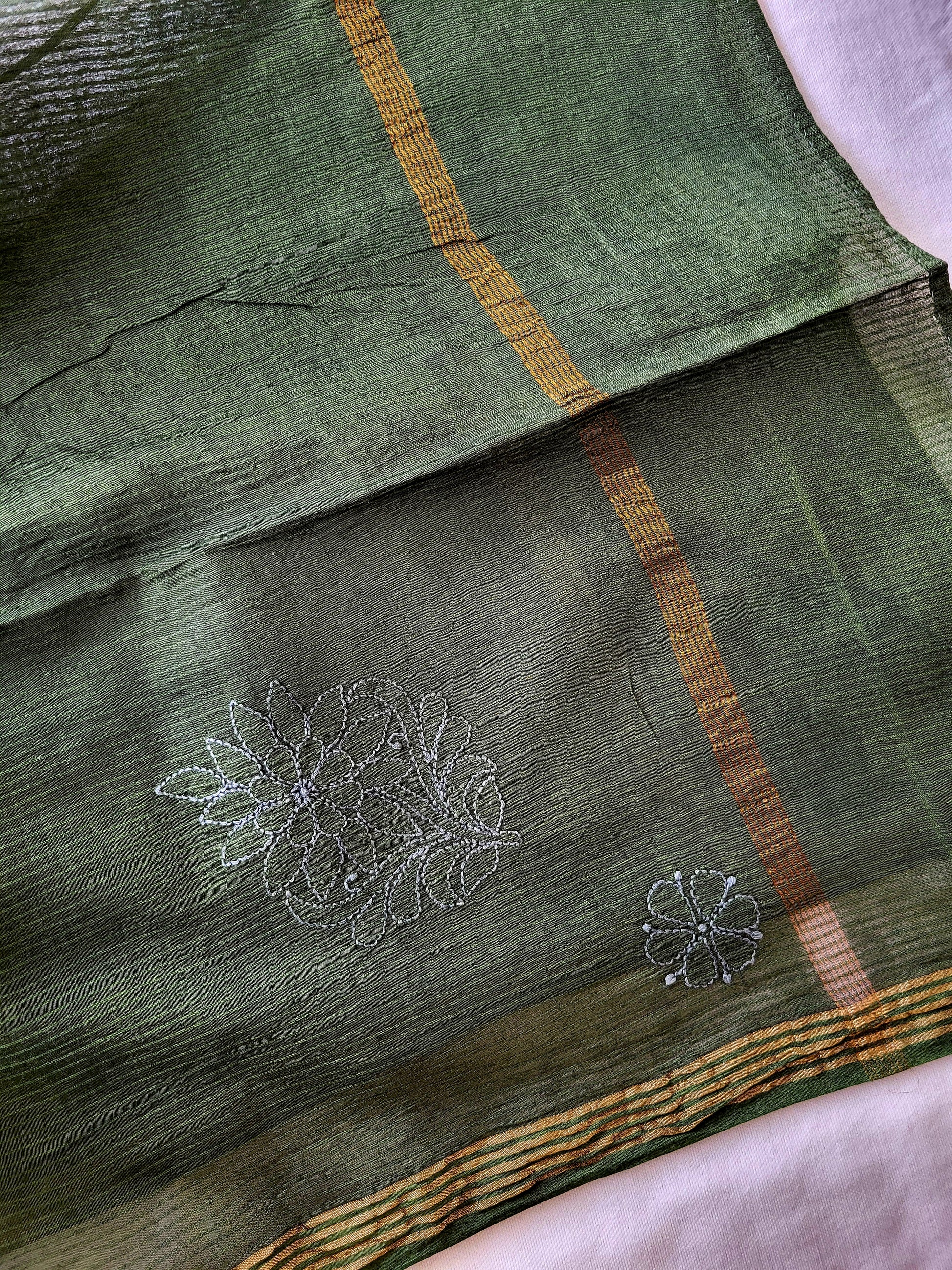 Chanderi Cotton Chikankari Dupatta (Bottle green)
