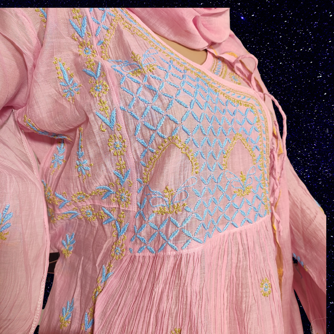 Mul Chanderi Semi Stitch Chikankari Anarkali Kurta fabric and Dupatta-Dyeable (Pink)