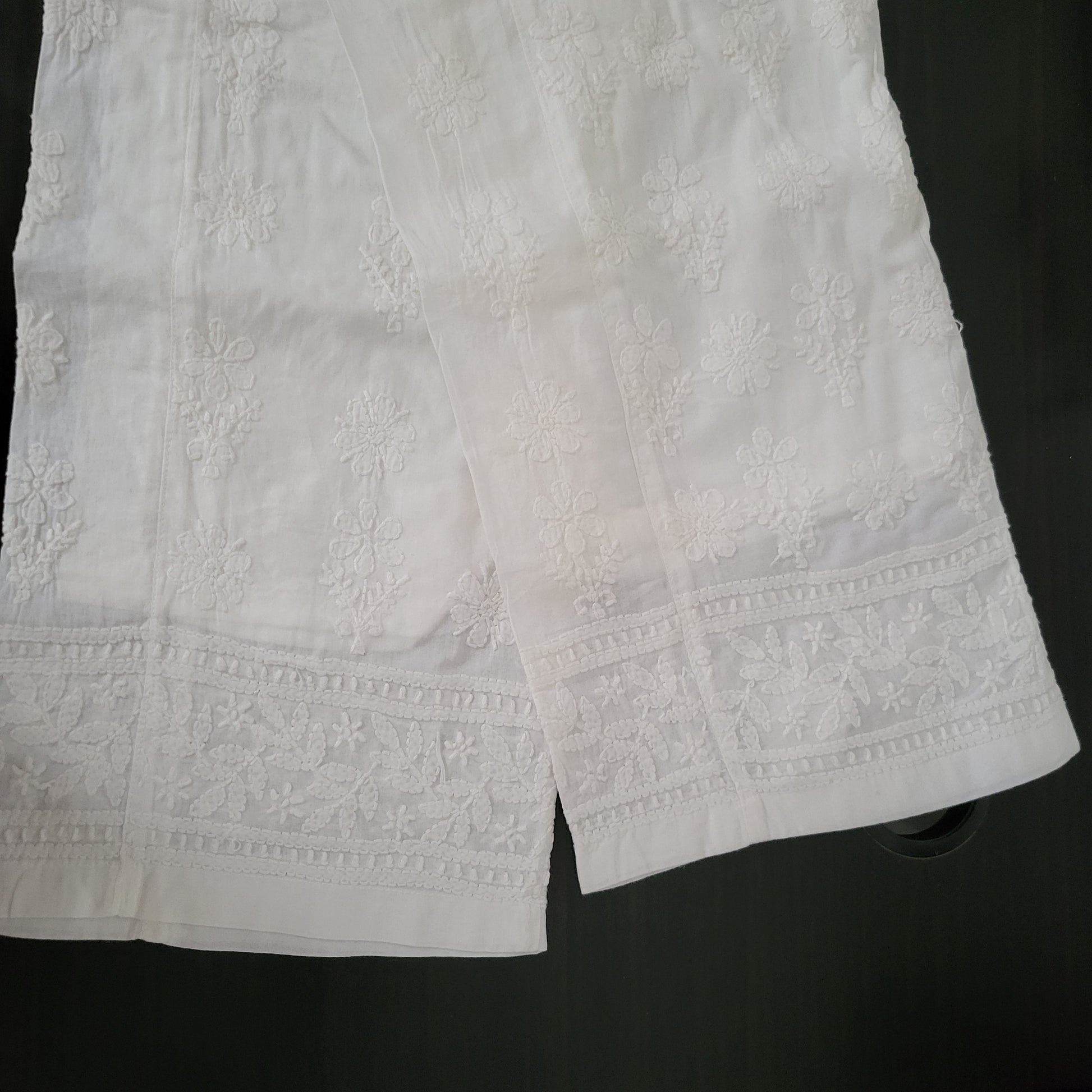 Team up these Cotton straight palazzo, with intricate detailing of Chikankari embroidery with bakhia, phanda and murri work , with an ethnic Kurta/top to outshine others in a casual evening, or a semi formal occasion.