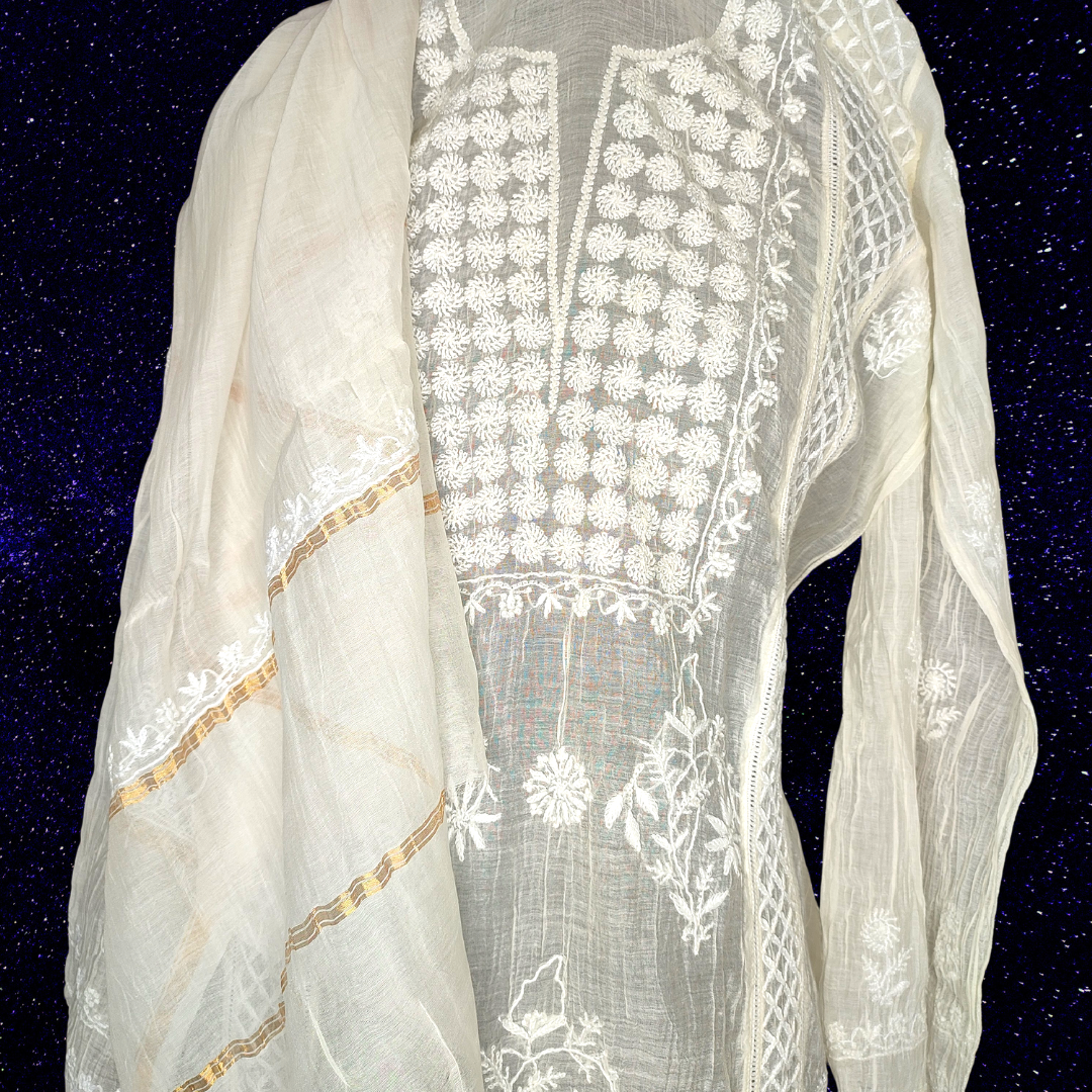 Mul Chanderi Semi Stitch Chikankari Staright Kurta fabric-Dyeable (White)