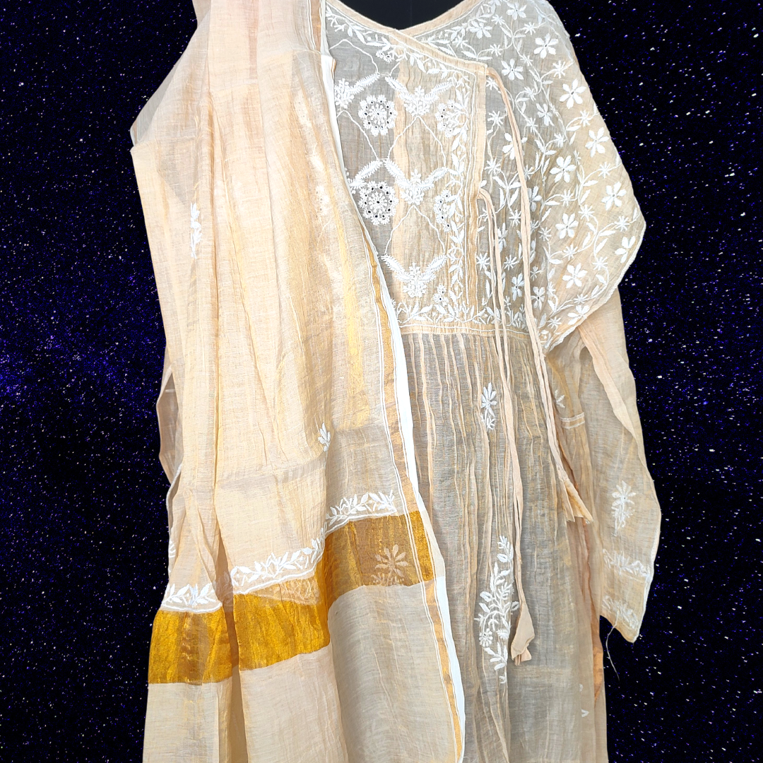 Chanderi Tissue Pure Silk Semi Stitch Chikankari Angarkha Kurta fabric and Dupatta-Dyeable